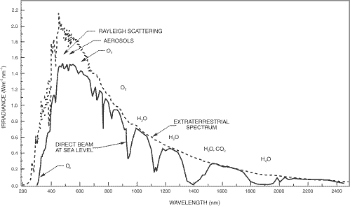 標準太陽光譜和穿透大氣層到達地球表面的太陽光譜如下: