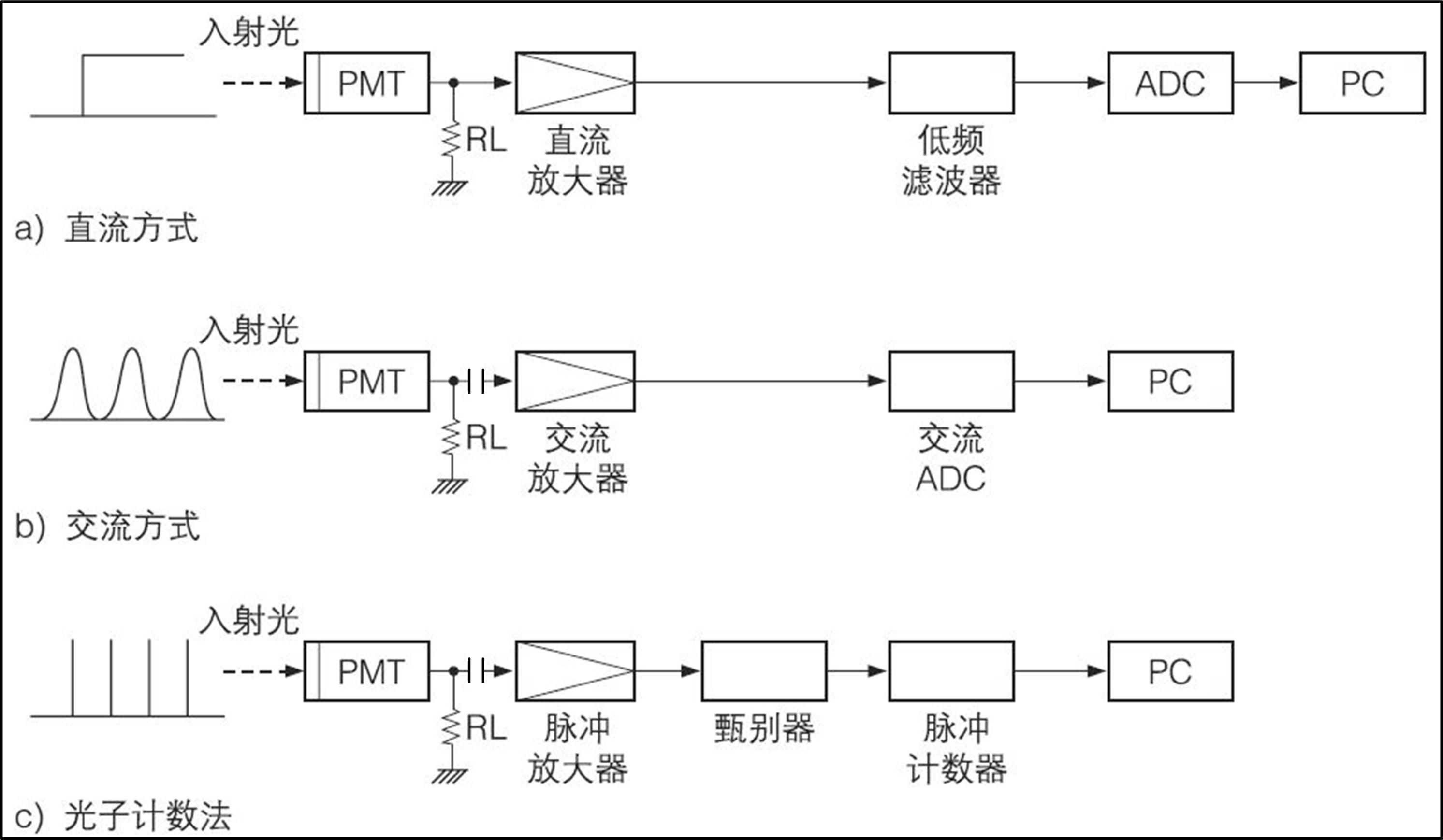 PMT連接分壓器和高壓便可從陽輸出電流信號,后續(xù)連接回路的設計根據(jù)入射光強的不同而有所區(qū)別,如圖5所示,其中a)直流方式,是將PMT的直流成分分別通過放大器、低通濾波器之后再進行檢測,該方法適用于探測光強相對較強的情況,且使用較為廣泛;b)交流方式,是將PMT的輸出通過電容器取其交流成分,再用平方檢波器將其變成直流成分進行檢測,該方法一般適用于光強較弱的情況,在此情況下,輸出信號中的交流成分壓制了直流成分而占主導地位;c)光子計數(shù)方式,是將PMT的輸出脈沖先放大,再經(jīng)過脈沖幅度甄別器進行選擇,然后對幅度在某一甄別電壓之上的脈沖進行計數(shù),該方法適用于觀察從PMT輸出的脈沖是離散的情況,因此其在微弱光探測領域即單光子領域是一種非常有效的方法。