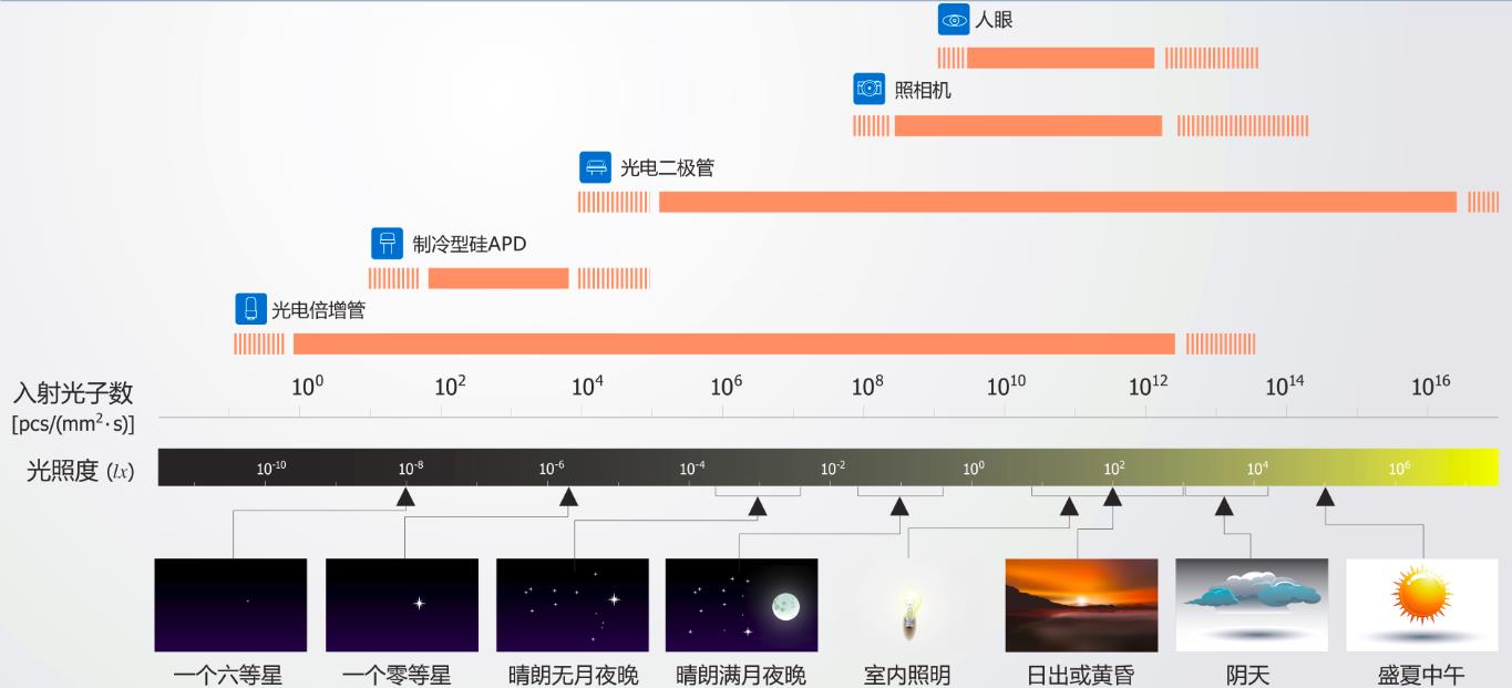 圖2 不同探測器件可探測光強范圍