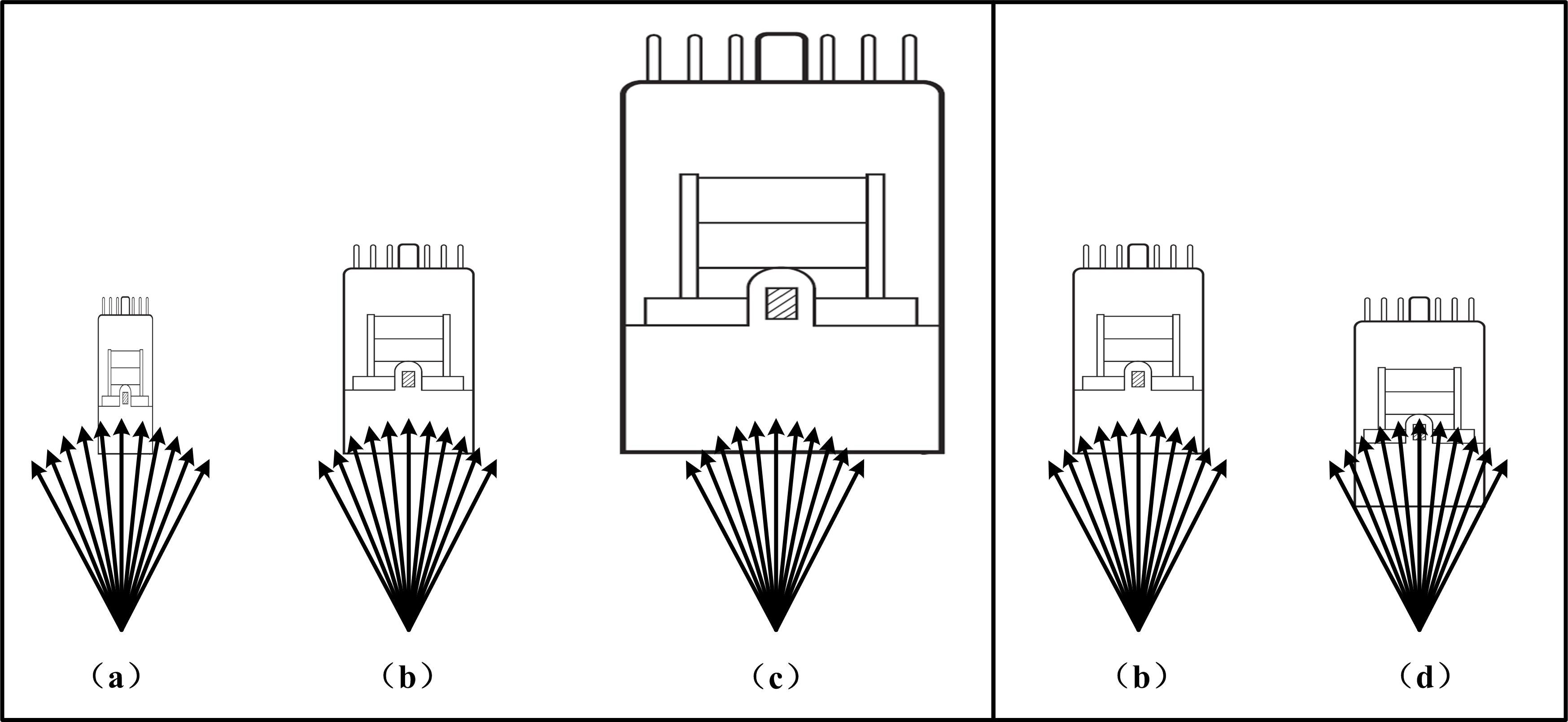 根據(jù)入射光的光斑形狀、大小、與PMT的距離關系等選擇合適的PMT。如狹縫形的光斑更適合用側(cè)窗型PMT。陰面大小選擇以盡量多的收集光束為原則,如圖2所示,在光源特性完全一致的情況下,(a)PMT陰面尺寸略小,不能有效收集光信號;(c)光信號雖可全部入射到PMT上,但光斑相對陰面尺寸過小,陰面邊緣部分沒有有效信號,卻會產(chǎn)生噪聲,使信噪比下降;(b)尺寸的選擇明顯優(yōu)于(a)和(c);(d)相比(b)而言,減小光源與PMT之間的距離,可提高光信號的收集效率、增大PMT的探測效率,是PMT的方案。
