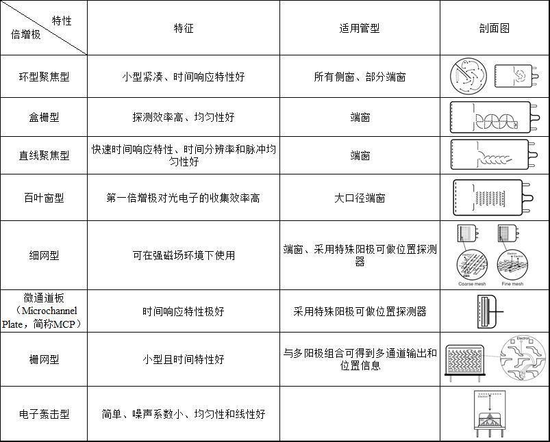 倍增有許多種類,由于其結(jié)構(gòu)、倍增的級數(shù)的不同而使得電流增益、時間響應特性、均勻性、二次電子收集效率特性等不同,要根據(jù)使用目的做相應的選擇。各倍增種類如表3所示。
