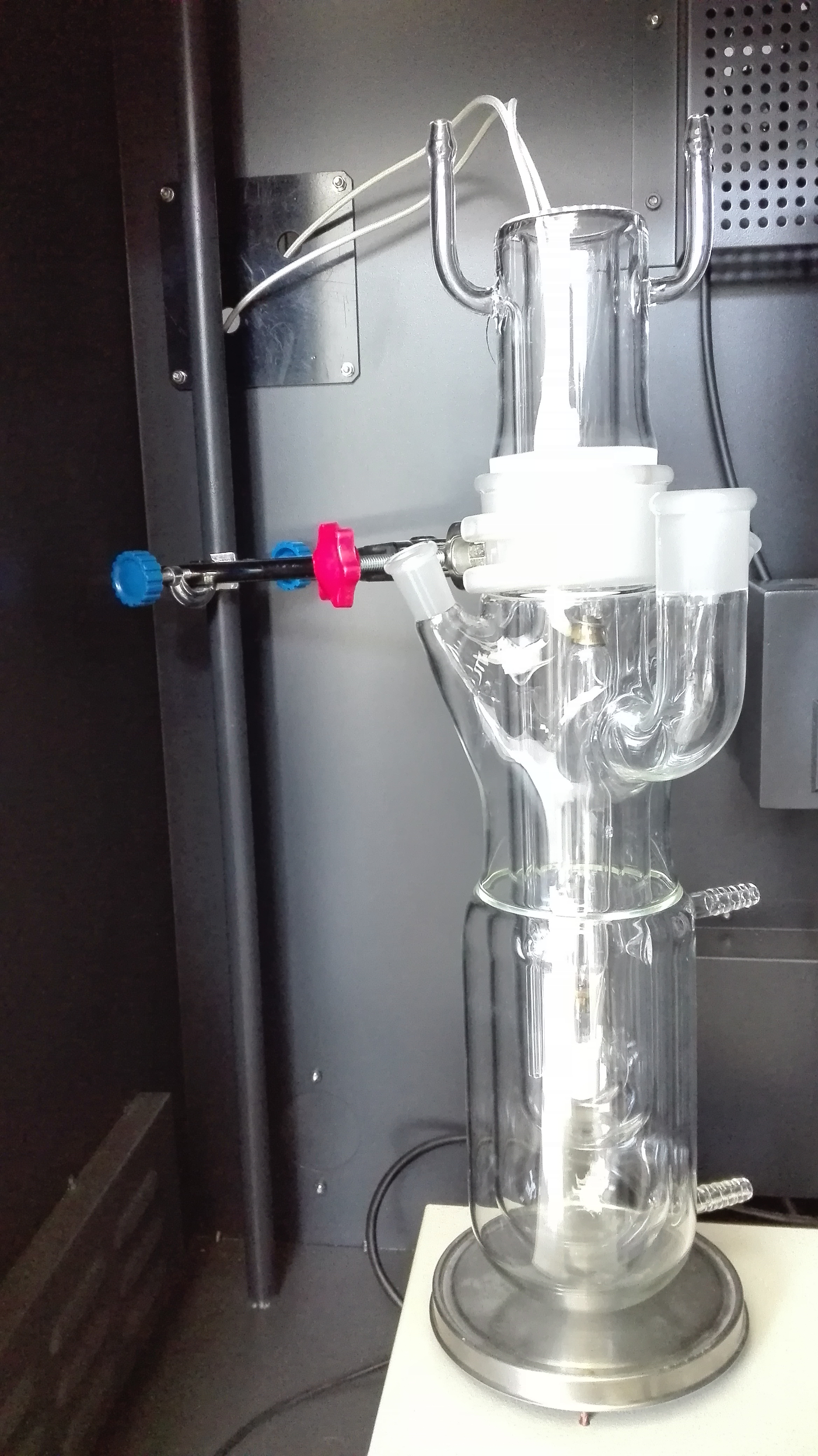 型號(hào):PH 250,采用PYREX玻璃,用于光化學(xué)反應(yīng)容器,可以配合冷阱、磁力攪拌,溶液可以有效的接收汞燈照射。反應(yīng)器有效容積250ml,磨口60/40,14/23,19/26,24/29。