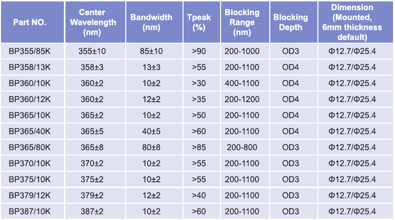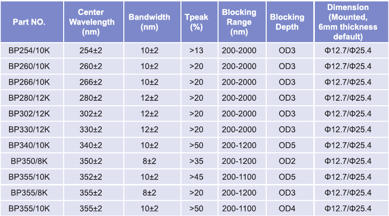 帶通濾光片波長范圍:254nm-355nm