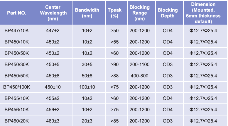 帶通濾光片波長范圍:447nm-460nm