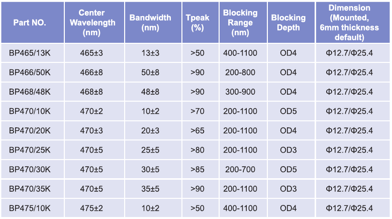 帶通濾光片波長范圍:465nm-475nm