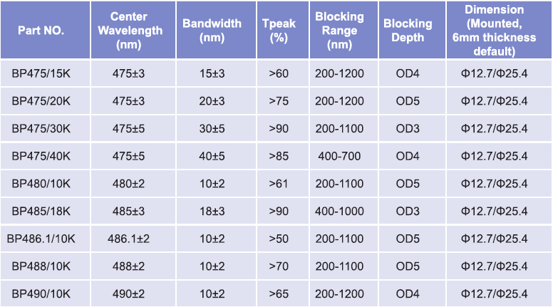 帶通濾光片波長范圍:475nm-490nm