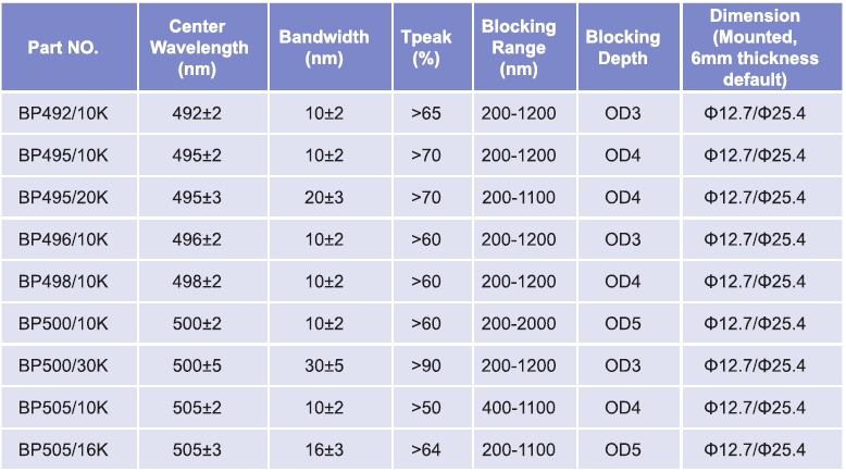 帶通濾光片波長范圍:492nm-505nm