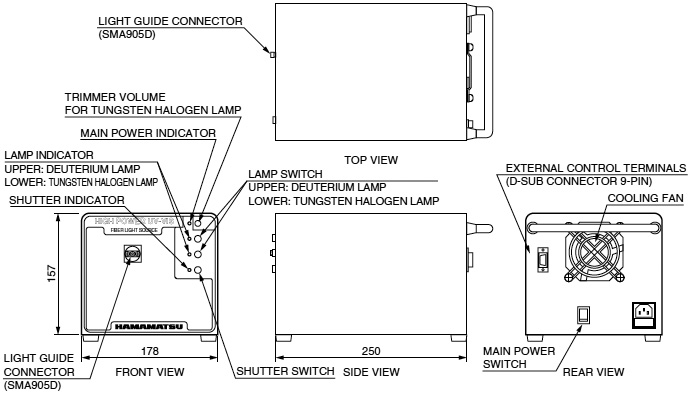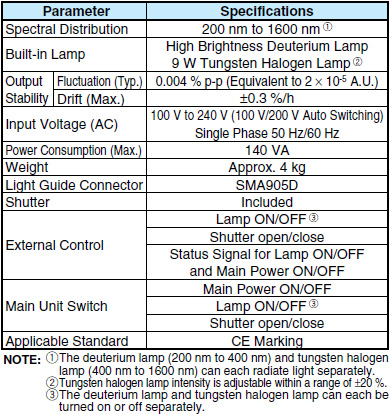 通過使用安裝在同一外殼內(nèi)的高亮度氘燈和鹵鎢燈,該光源能通過光波導(dǎo)(單賣)輸出200nm1600nm的光。輸出的光強(qiáng)大約是現(xiàn)有型號(hào)的兩倍。緊湊的尺寸和較輕的重量使其易于攜帶。機(jī)械快門和外部控制等實(shí)用的功能使其易于使用。這種新型光源同時(shí)適用于多種型號(hào)的便攜式設(shè)備。