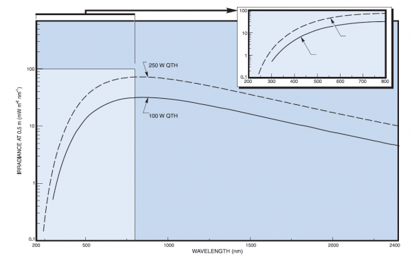 The Light Source uses different power lamps as its illumination source. This Tungsten Halogenlamp exhibit better output stability than arc lamps and do not produce strong UV light emission or toxic ozone. Their smooth spectral output curve make them useful for radiometric and photometric applications.