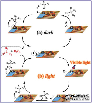 TiO2@NC-Ru-T中氮摻雜碳不僅增強了Ru納米顆粒的催化性能,同時通過Mott-Schottky接觸促進了光活化Ru納米顆粒中光生電子向TiO2的輸運。在可見光照射下,上述效應可以大增強乙醇在空氣中的選擇性需氧氧化。這一研究為光催化反應中提高可見光吸收和電荷/電子轉移提供了可行的方法,也為開發(fā)將太陽能轉化為相關化學品的能源轉換反應催化劑指明了新的方向。