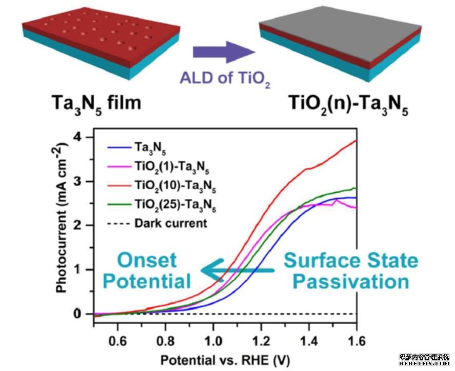 在對TiO2鈍化層的研究中,羅文俊課題組通過化學(xué)浴沉積的方法在Ta3N5上制備了一層TiO2,并且發(fā)現(xiàn)水溶液法制備的TiO2中含有的羥基基團會影響電的性能。