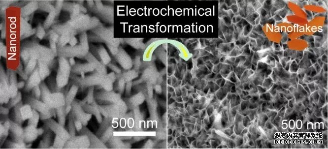 Yat Li課題組通過對Fe2O3納米棒進行電化學(xué)誘導(dǎo),生成了約10 nm 厚的納米片狀Fe2O3,其光電流也提高了3倍。(上圖,DOI:10.1016/j.nanoen.2014.12.023)