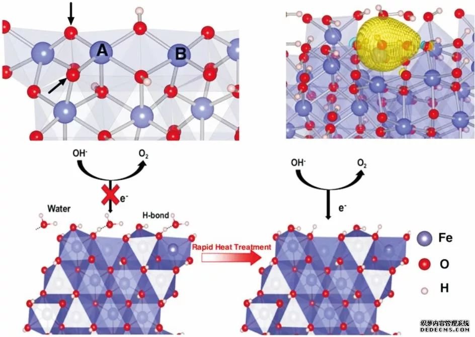 羅文俊課題組發(fā)現(xiàn)通過高溫短時間煅燒除去α-FeOOH 表面吸附水的方法,可以提高α-FeOOH 的產(chǎn)氧活性和穩(wěn)定性,通過理論計算發(fā)現(xiàn),表面吸附水會與FeOOH 表面的O形成強的氫鍵,影響活性位點對OH- 的吸附和氧化,從而影響了其產(chǎn)氧的活性。 (DOI:10.1039/C6TA08719A)