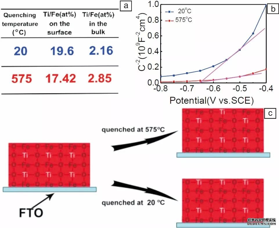 除了在材料制備后對表面偏析相進行處理外,黃維院士團隊對Fe2O3的煅燒過程進行改進,發(fā)現(xiàn)通過短時間淬火的方式,能夠在制備過程中就降低表面的偏析、提高體相摻雜濃度,從而提高Fe2O3電的性能。XPS表征發(fā)現(xiàn),通過短時間高溫淬火可以有效降低Fe2O3表面的Ti偏析, 莫特肖特基曲線也發(fā)現(xiàn)高溫淬火后的載流子濃度相比于 常溫取出的Fe2O3高了6 倍,因此他們認為高 溫淬火的方式可以將摻雜離子固定在材料晶格內(nèi)部,防止向表面偏析,從而減小表面復(fù)合,提高材料光電化學(xué)性能。(上圖,DOI:10.1002/cnma.201600108)